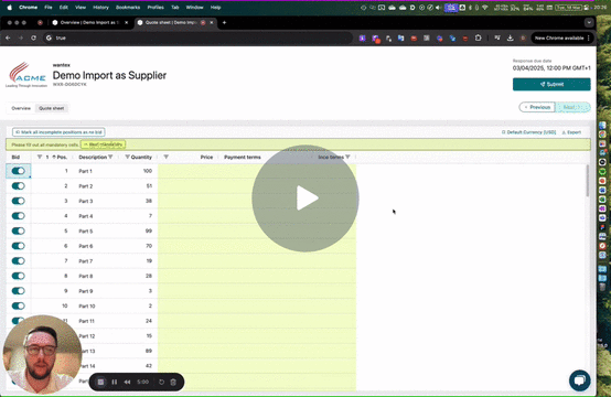 The buyer will send you an email invite which contains a link to access the event in wantex. You are asked to provide at minimum the mandatory information marked in yellow. wantex makes it easy for you to provide the required information. Use our AI to transform any quote from PDF into the required format or complete the quote sheet using excel.